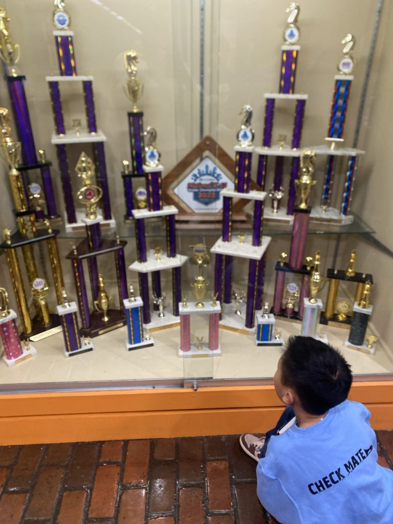 As the tour continued, we reached a dedicated chess trophy case—separate from the other sports trophies housed elsewhere in the building. This case held years of accomplishments: towering trophies from national events, polished plaques, and awards that reflected both team success and individual excellence.